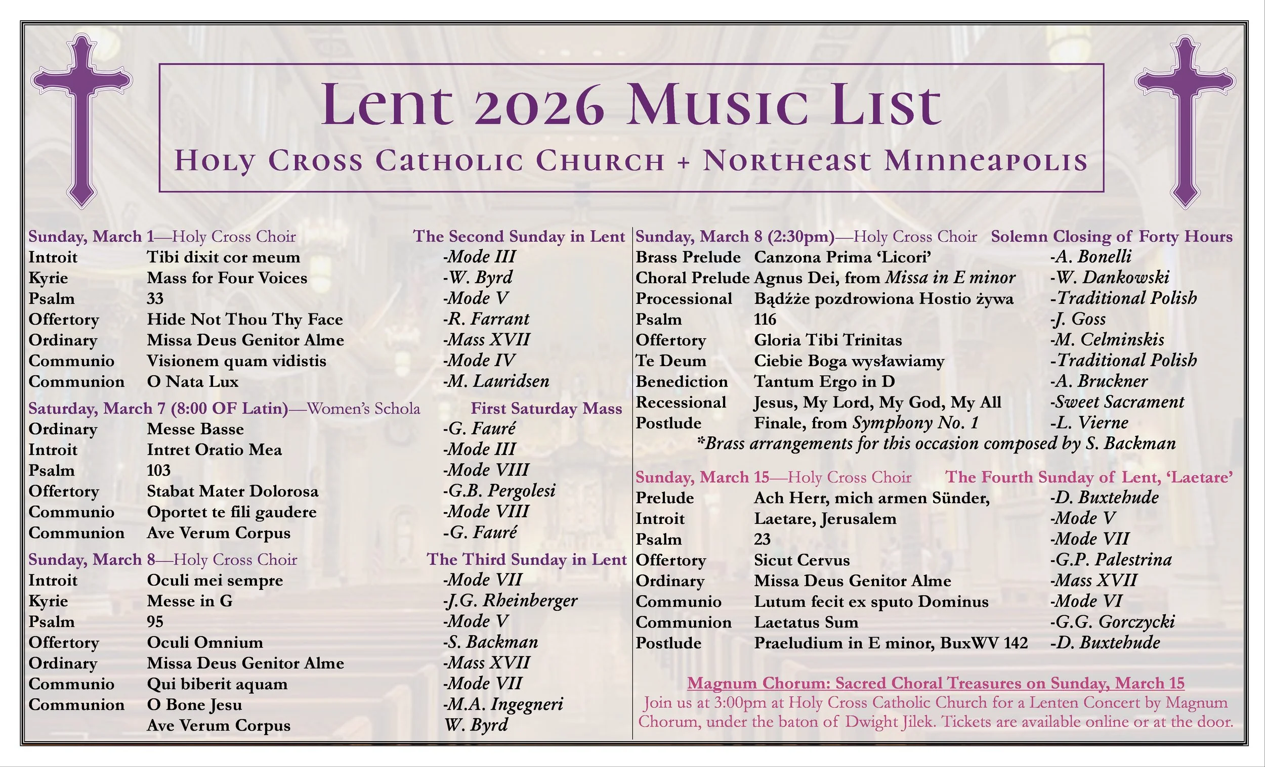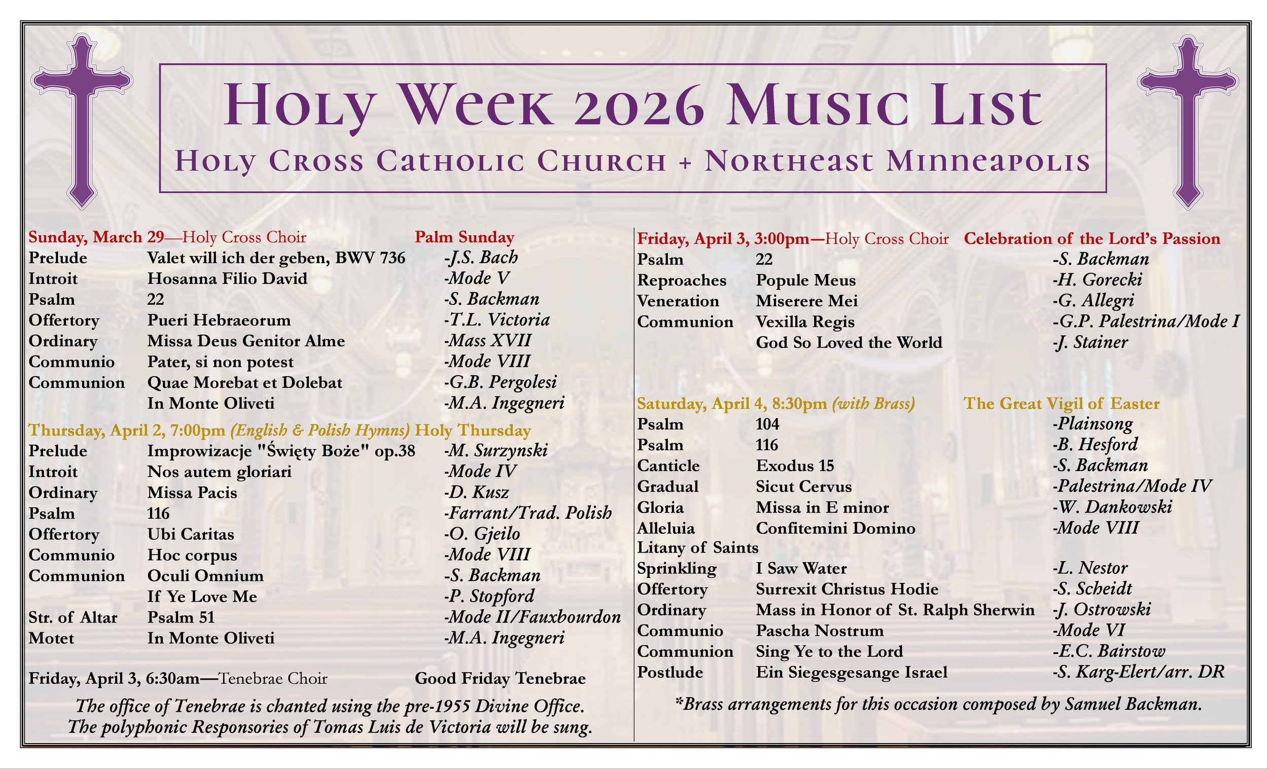 As proud home of Minnesota’s only full-service Polish Catholic apostolate, the rich heritage of Polish hymnody forms an essential part of our parish’s musical fabric. The Polish Choir of Holy Cross provides musical leadership for 11:30am Sunday Masses (in Polish) and Holy Days of Obligation. Because this ensemble sings primarily in Polish, members must be at least fluent in the phonetics of the Polish language.