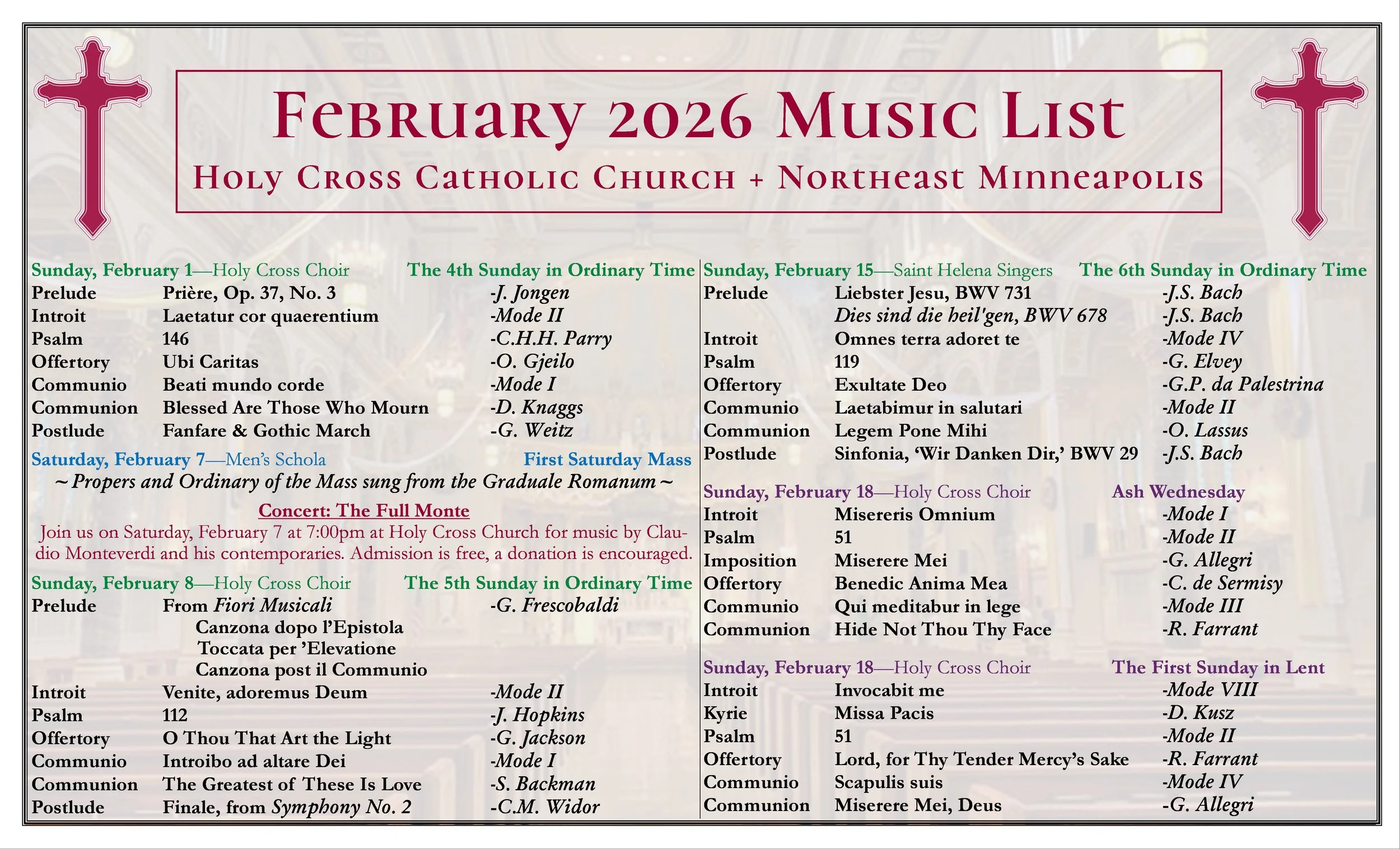 Holy Cross Catholic Church holds Sacred Music in high esteem as an essential and integral part of our Divine Worship. Sacred Music is ordered first and foremost toward the glory of Almighty God, but it also plays an important role in the sanctification and edification of the gathered faithful. The Holy Sacrifice of the Mass is intended to be a foretaste of the Heavenly Banquet, and Sacred Scripture—particularly the Book of Revelations—makes frequent reference to the celestial beings praising God in song. For this reason, Holy Cross is committed to fostering excellence in our Sacred Music at each of our three campuses, such that it may serve as a worthy foretaste of eternity with the triune God.