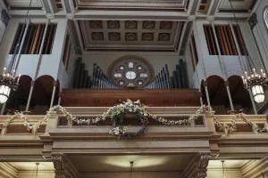 While all the pipes of the Hinner Organ were incorporated into the new and enlarged instrument, the mechanical key action was replaced with direct electric action. In 1994, the organ underwent substantial repairs due to a fire. In 1997, further additions, such as the organ’s regal Tuba Mirabilis stop, were made. At present, the organ contains 34 ranks, 3 manuals (keyboards), and over 2,200 pipes.